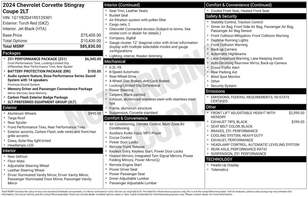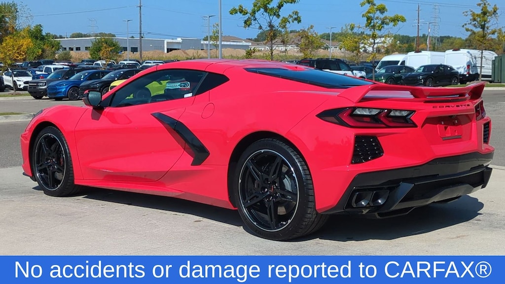 Clean CARFAX. Certified. 2024 Chevrolet Corvette Stingray 2LT Is nicely equipped with Battery Protection Package, Memory Driver & Passenger Convenience Package, Preferred Equipment Group 2LT (2 Cargo Nets, Bose Performance Series Sound System w/14 Speakers, Driver Power Bolster Seat Adjuster, Electrical Theft Deterrent System, HD Front & Rear Vision Cameras, Head-Up Display, Heated & Vented Driver & Passenger Seats, Heated Steering Wheel, Passenger Power Bolster Seat Adjuster, Performance Data & Video Recorder, Power Driver Lumbar Control Seat Adjuster, Power Passenger Lumbar Control Seat Adjuster, Power-Adjustable Outside Heated Mirrors, Rear Cross Traffic Alert, Side Blind Zone Alert, Universal Home Remote, Vehicle Inclination Theft Deterrent Sensor, Vehicle Interior Movement Theft Deterrent Sensor, and Wireless Charging for Devices), Z51 Performance Package (Electronic Limited-Slip Differential, Heavy-Duty Cooling System, Performance Exhaust w/Stainless-Steel Tips, Performance Rear Axle Ratio, Rear Z51 Spoiler, Z51 Performance Brakes, and Z51 Performance Suspension), Ford Blue Advantage: Blue Certified Certified, Automatic Leveling System Headlamp Control, Front Lift Adjustable Height w/Memory, Wheels: 19" x 8.5" Fr/20" x 11" Rr Carbon Flash, 14 Speakers, 4-Wheel Disc Brakes, 8-Way Power Driver Seat Adjuster, 8-Way Power Passenger Seat Adjuster, ABS brakes, Air Conditioning, Alloy wheels, AM/FM radio: SiriusXM, Auto High-beam Headlights, Auto-dimming door mirrors, Auto-dimming Rear-View mirror, Automatic temperature control, Black Exhaust Tips, Body-Color Removable Roof Panel, Brake assist, Bumpers: body-color, Compass, Delay-off headlights, Driver door bin, Driver vanity mirror, Dual front impact airbags, Dual front side impact airbags, Electronic Stability Control, Emergency communication system: OnStar and Chevrolet connected services capable, Exterior Parking Camera Rear, Four wheel independent suspension, Front anti-roll bar, Front Bucket Seats, Front Center Armrest, Front dual zone A/C, Front reading lights, Fully automatic headlights, Garage door transmitter, GT1 Bucket Seats, Heads-Up Display, Heated door mirrors, Heated front seats, Heated steering wheel, Illuminated entry, Leather Shift Knob, Leather steering wheel, Low tire pressure warning, Memory seat, Mulan Lthr Seating Surfaces w/Perforated Inserts, Navigation System, Occupant sensing airbag, Outside temperature display, Overhead console, Panic alarm, Passenger door bin, Passenger vanity mirror, Power door mirrors, Power driver seat, Power passenger seat, Power steering, Power windows, Premium audio system: Chevrolet Infotainment 3 Premium, Radio data system, Radio: Chevrolet Infotainment 3 Premium System, Rear anti-roll bar, Rear window defroster, Remote keyless entry, Security system, Speed control, Speed-sensing steering, Sport steering wheel, Steering wheel memory, Steering wheel mounted audio controls, Tachometer, Telescoping steering wheel, Tilt steering wheel, Traction control, Trip computer, Turn signal indicator mirrors, Variably intermittent wipers, Ventilated front seats, and Voltmeter.