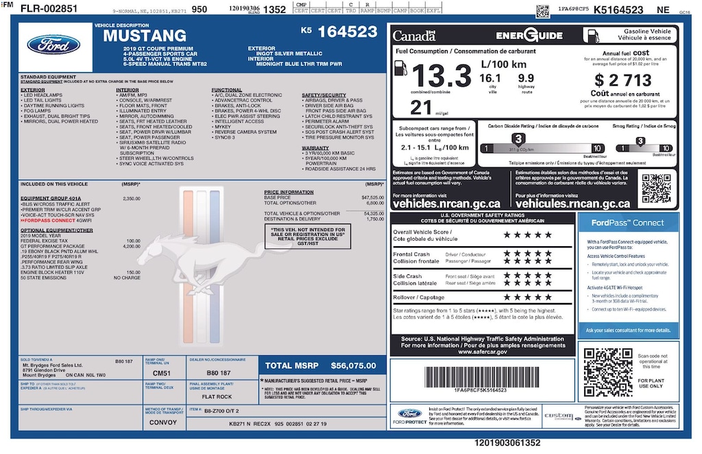 Clean CARFAX. Certified. 2019 Ford Mustang GT Premium Is nicely equipped with GT Performance Package (3.73 TORSEN Differential Ltd Slip Rear Axle Ratio, Engine Spun Aluminum Instrument Panel, Gauge Pack (Oil Pressure & Vacuum), HD Front Springs, Larger Brake Rotors, Larger Radiator, Unique Stability Control, and Wheels: 19" x 9" Fr & 19" x 9.5" Rr Ebony Black), Ford Blue Advantage: Blue Certified Certified, 4-Wheel Disc Brakes, ABS brakes, Air Conditioning, Alloy wheels, AM/FM Stereo, Auto-dimming Rear-View mirror, Brake assist, Bumpers: body-color, Compass, Delay-off headlights, Driver door bin, Driver vanity mirror, Dual front impact airbags, Dual front side impact airbags, Electronic Stability Control, Emergency communication system: 911 Assist, Exterior Parking Camera Rear, Four wheel independent suspension, Front anti-roll bar, Front Bucket Seats, Front Center Armrest, Front fog lights, Front reading lights, Fully automatic headlights, Illuminated entry, Knee airbag, Low tire pressure warning, Occupant sensing airbag, Outside temperature display, Overhead airbag, Overhead console, Panic alarm, Passenger door bin, Passenger vanity mirror, Power door mirrors, Power driver seat, Power passenger seat, Power steering, Power windows, Radio data system, Rear anti-roll bar, Rear window defroster, Remote keyless entry, Security system, SiriusXM Radio, Speed control, Speed-sensing steering, Speed-Sensitive Wipers, Split folding rear seat, Spoiler, Steering wheel mounted audio controls, SYNC 3 Communications & Entertainment System, Tachometer, Telescoping steering wheel, Tilt steering wheel, Traction control, Trip computer, Variably intermittent wipers, Voltmeter, and Wheels: 18" x 8" Machined-Face Aluminum.
