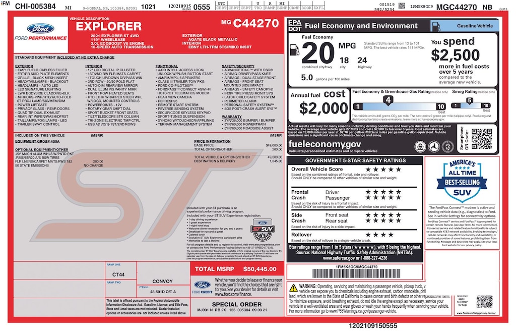 Certified. 2021 Ford Explorer ST Is nicely equipped with Equipment Group 400A, Ford Blue Advantage: Blue Certified Certified, 4WD, 20" Machined Aluminum w/Painted Pockets Wheels, 3.58 Non-Limited-Slip Rear Axle Ratio, 3rd row seats: bench, 4-Wheel Disc Brakes, 6 Speakers, ABS brakes, Air Conditioning, Alloy wheels, AM/FM radio: SiriusXM, AM/FM Stereo, Auto High-beam Headlights, Automatic temperature control, Brake assist, Bumpers: body-color, Compass, Delay-off headlights, Driver door bin, Driver vanity mirror, Dual front impact airbags, Dual front side impact airbags, Electronic Stability Control, Emergency communication system: SYNC 3 911 Assist, Exterior Parking Camera Rear, FordPass Connect, Four wheel independent suspension, Front & Second Row Floor Liners (16B), Front anti-roll bar, Front Bucket Seats, Front Center Armrest, Front dual zone A/C, Front fog lights, Front reading lights, Fully automatic headlights, Heated door mirrors, Heated front seats, Heated steering wheel, Illuminated entry, Knee airbag, Leather steering wheel, Low tire pressure warning, Occupant sensing airbag, Outside temperature display, Overhead airbag, Overhead console, Panic alarm, Passenger door bin, Passenger vanity mirror, Power door mirrors, Power driver seat, Power Liftgate, Power passenger seat, Power steering, Power windows, Rear air conditioning, Rear anti-roll bar, Rear reading lights, Rear window defroster, Rear window wiper, Remote keyless entry, Security system, SelectShift Capability w/Paddle Shifters, Speed control, Speed-sensing steering, Speed-Sensitive Wipers, Split folding rear seat, Spoiler, Sport steering wheel, Steering wheel mounted audio controls, SYNC 3 Communications & Entertainment System, SYNC 3/Apple CarPlay/Android Auto, Tachometer, Telescoping steering wheel, Tilt steering wheel, Traction control, Trip computer, and Variably intermittent wipers.