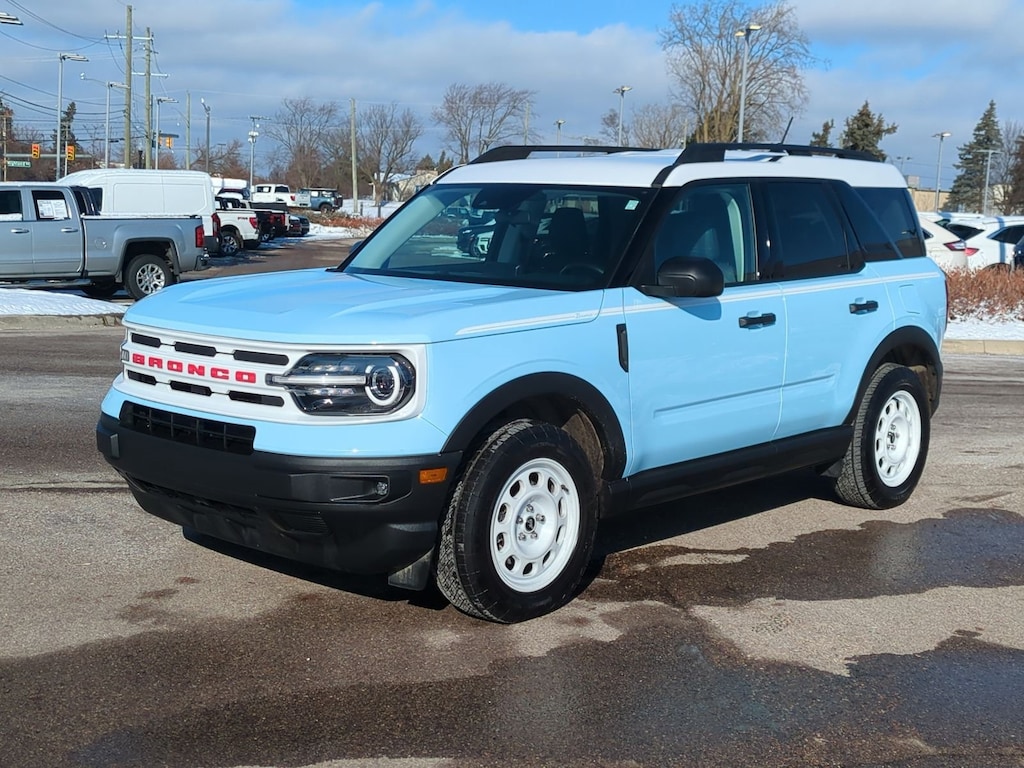 This one is special. Finished in Robins Egg Blue with an Oxford White roof and classic plaid cloth interior, this 2023 Bronco Sport Heritage 4X4 is a rare find and a true throwback to the original Bronco heritage with modern tech and capability.