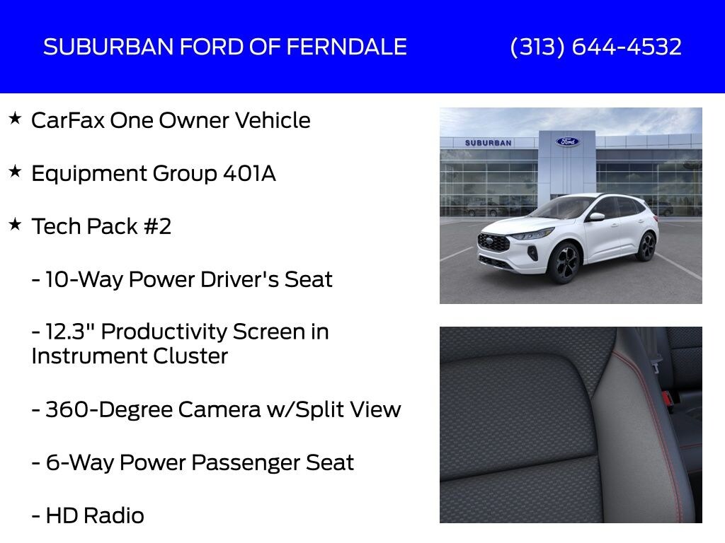 Star White Metallic Tri-Coat 2024 Ford Escape ST-Line Select AWD 8-Speed Automatic EcoBoost 2.0L I4 GTDi DOHC Turbocharged VCT CarFax One Owner Vehicle, AWD, 10-Way Power Driver's Seat, 12.3" Productivity Screen in Instrument Cluster, 360-Degree Camera w/Split View, 6-Way Power Passenger Seat, Adaptive Cruise Control w/Stop-and-Go, AM/FM Radio: SiriusXM, Automatic Temperature Control, Body Color Mirrors, Equipment Group 401A, Exterior Parking Camera Rear, Ford Co-Pilot360 Assist 2.0, Front Dual Zone A/C, Fully Automatic Headlights, HD Radio, Heated External Mirrors, Memory Package, Power Driver Seat, Power Liftgate, Radio: B&O Sound System by Bang & Olufsen, Rear Window Defroster, SYNC 4 w/Enhanced Voice Recognition, Tech Pack #2, Wireless Charging Pad.