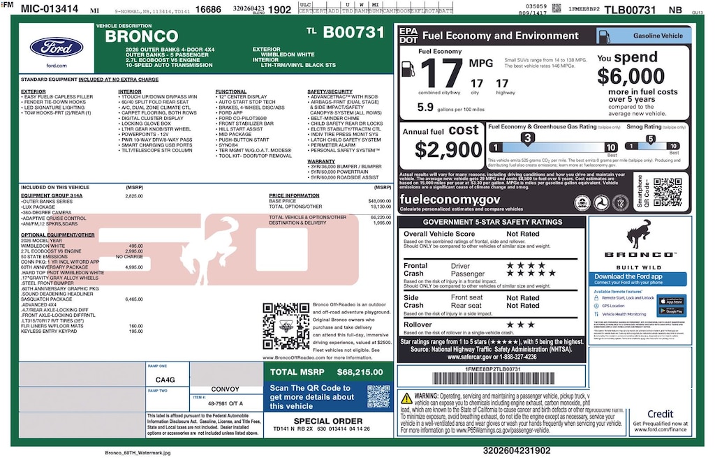 Recent Arrival! 2026 Ford Bronco Outer Banks Is nicely equipped with 60th Anniversary Package (Black Molded-in-Color Door Handles, Hard Top Sound Deadening Headliner, Leather-Trimmed/Vinyl Bucket Seats, Painted Door Handles, Steel Front Bumper, Warm Alloy Grille, Wheels: 17" Gravity Gray-Painted Alloy, and Wimbledon White-Painted Hard Top), Equipment Group 314A Lux Package (18" Bright Machined Aluminum Wheels, 360-Degree Camera, Adaptive Cruise Control, Evasive Steering Assist, Front Parking Sensors, Heated Leather-Trimmed/Vinyl Bucket Seats, Information on Demand Panel, and Sideview Mirrors), Ford Connectivity Package (1-Year Included), Sasquatch Package (High Clearance Fender Flares, High Clearance Suspension, Position-Sensitive Bilstein Shock Absorbers, and Wheels: 17" Matte Black Alloy), 4-Wheel Disc Brakes, 7 Speakers, ABS brakes, Air Conditioning, Alloy wheels, AM/FM radio: SiriusXM with 360L, AM/FM Stereo, Auto High-beam Headlights, Auto-dimming Rear-View mirror, Automatic temperature control, Brake assist, Compass, Connected Navigation, Delay-off headlights, Driver door bin, Driver vanity mirror, Dual front impact airbags, Dual front side impact airbags, Electronic Stability Control, Emergency communication system: 911 Assist, Exterior Parking Camera Rear, Front and Rear Floor Liners, Front anti-roll bar, Front Bucket Seats, Front Center Armrest, Front dual zone A/C, Front fog lights, Front reading lights, Front wheel independent suspension, Fully automatic headlights, Heated door mirrors, Heated front seats, Heated steering wheel, Illuminated entry, Integrated roll-over protection, Keyless Entry Keypad, Leather Shift Knob, Low tire pressure warning, Navigation system: Connected Navigation, Occupant sensing airbag, Outside temperature display, Overhead airbag, Overhead console, Panic alarm, Passenger door bin, Passenger vanity mirror, Power door mirrors, Power driver seat, Power passenger seat, Power steering, Power windows, Radio data system, Rear seat center armrest, Remote keyless entry, Security system, SiriusXM with 360L, Speed control, Split folding rear seat, Steering wheel mounted audio controls, SYNC 4, Tachometer, Telescoping steering wheel, Tilt steering wheel, Traction control, Trip computer, Variably intermittent wipers, and Voltmeter. Factory MSRP: $68,215 Dealer Discount of $5,125 off MSRP