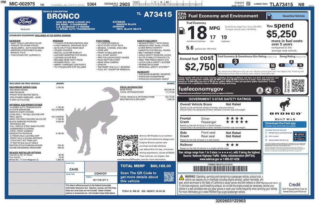 Recent Arrival! 2026 Ford Bronco Big Bend Is nicely equipped with Black Diamond Package (Auxiliary Switches, LED Fog Lamps, Powder Coated Steel Front and Rear Bumpers, Rock Rails, Washout Capable Rubberized Flooring, and Wheels: 17" Black High Gloss-Painted Steel), Equipment Group 222A Mid Package (2-Door Intelligent Access with Lock/Unlock, AM/FM Stereo, Ambient Footwell Lighting, Cloth Bucket Seats, Connected Navigation, Driver and Front Passenger Illuminated Sliding Visor Vanity Mirrors, Dual Smart Charging USB Ports, Dual-Zone Electronic Automatic Temperature Control, Front Row Heated Seats, Pro Power Onboard - 400W, Rear Parking Sensors, SiriusXM with 360L, SYNC 4, and Wheels: 17" Carbonized Gray-Painted Aluminum), Ford Connectivity Package (1-Year Included), Sasquatch Package (High Clearance Fender Flares, High Clearance Suspension, Position-Sensitive Bilstein Shock Absorbers, and Wheels: 17" Matte Black Alloy), 4-Wheel Disc Brakes, 7 Speakers, ABS brakes, Air Conditioning, Alloy wheels, AM/FM radio: SiriusXM with 360L, Auto High-Beam Headlamps, Auto High-beam Headlights, BLIS Blind Spot Information System, Brake assist, Carbonized Gray Molded-in-Color Hard Top, Compass, Delay-off headlights, Driver door bin, Driver vanity mirror, Dual front impact airbags, Dual front side impact airbags, Electronic Stability Control, Emergency communication system: 911 Assist, Exterior Parking Camera Rear, First Aid Kit, Front anti-roll bar, Front Bucket Seats, Front Center Armrest, Front reading lights, Front wheel independent suspension, Fully automatic headlights, Hard Top Sound Deadening Headliner, Heated door mirrors, Illuminated entry, Integrated roll-over protection, Lane-Keeping System, Low tire pressure warning, Occupant sensing airbag, Outside temperature display, Overhead airbag, Overhead console, Panic alarm, Passenger door bin, Passenger vanity mirror, Power door mirrors, Power steering, Power windows, Pre-Collision Assist with Automatic Emergency Braking, Radio data system, Raptor-Style Running Board, Rear-View Camera, Rear-Window Defroster and Washer, Remote keyless entry, Security system, Speed control, Split folding rear seat, Steering wheel mounted audio controls, Tachometer, Telescoping steering wheel, Tilt steering wheel, Traction control, Trip computer, and Variably intermittent wipers. Factory MSRP: $60,165 Dealer Discount of $4,100 off MSRP