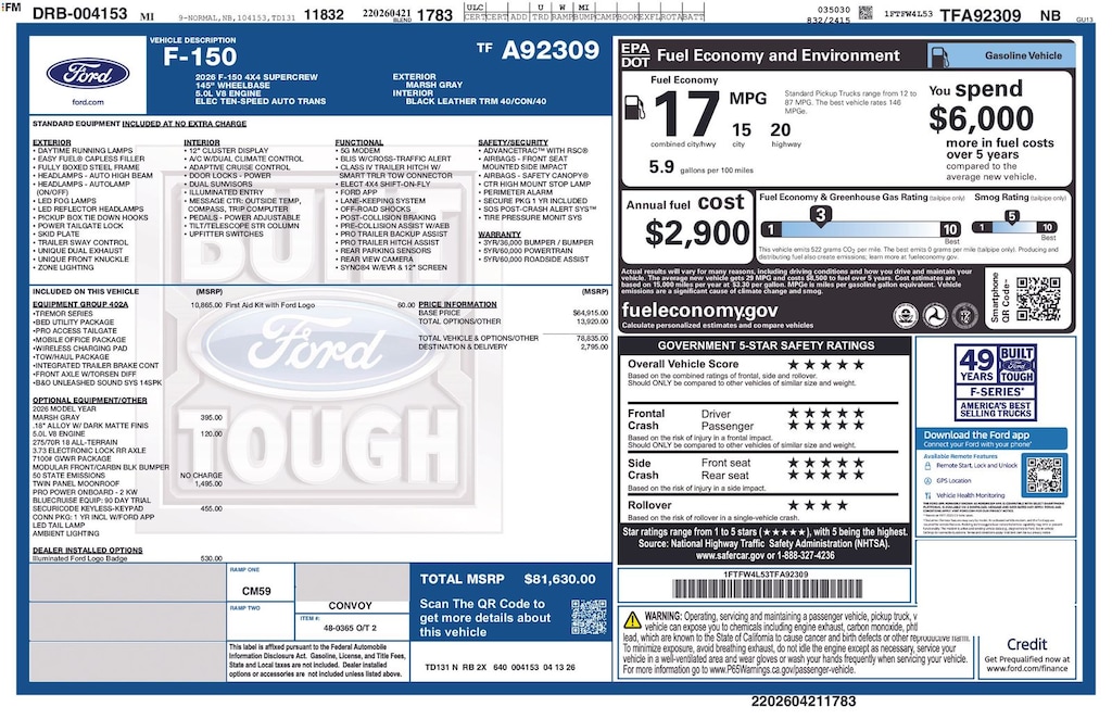 Recent Arrival! 2026 Ford F-150 Tremor Is nicely equipped with Bed Utility Package (4 Pickup Box Tie-Down Plates, LED Box Lighting, and Power Tailgate), Equipment Group 402A High (2nd Row Heated Seats, Auto-Dimming Rear-View Mirror, Electronic Locking with 3.73 Axle Ratio, Front Axle with Torsen Differential, Heated Steering Wheel, LED Taillamps, Media Bin Door, Modular Front Bumper and Carbon Black Rear Bumper, Power Glass Heated Sideview Mirrors, Power-Adjustable Pedals with Memory, Radio: B&O Unleashed Sound System by Bang & Olufsen, Rain-Sensing Wipers, Unique Tremor Leather-Trimmed Seats, Universal Garage Door Opener, and Wheels: 18" Alloy with Dark Matte Finish), Ford Connectivity Package (1-Year Included), GVWR: 7,050 lbs Payload Package, Internet access capable: 5G Modem - Ford Connectivity Package, Mobile Office Package (Console Worksurface, Partitioned Lockable Rear Storage, and Wireless Charging), Tow/Haul Package (Integrated Trailer Brake Controller), 4WD, 4-Wheel Disc Brakes, 8 Speakers, ABS brakes, Adjustable pedals, Air Conditioning, Alloy wheels, AM/FM radio: SiriusXM with 360L, Auto High-beam Headlights, Auto-dimming Rear-View mirror, Automatic temperature control, Brake assist, Bumpers: body-color, Compass, Delay-off headlights, Driver door bin, Driver vanity mirror, Driver's Side SecuriCode Keyless-Entry Keypad, Dual front impact airbags, Dual front side impact airbags, Electronic Stability Control, Emergency communication system: SYNC 4 911 Assist, First Aid Kit with Ford Logo, Front anti-roll bar, Front Bucket Seats, Front Center Armrest, Front dual zone A/C, Front fog lights, Front reading lights, Front wheel independent suspension, Fully automatic headlights, Heated door mirrors, Heated front seats, Illuminated entry, Illuminated Ford Logo Badge, Low tire pressure warning, Navigation system: Connected Navigation, Occupant sensing airbag, Outside temperature display, Overhead airbag, Overhead console, Panic alarm, Passenger door bin, Passenger vanity mirror, Power door mirrors, Power driver seat, Power passenger seat, Power steering, Power windows, Radio data system, Radio: B&O Sound System by Bang and Olufsen, Rear reading lights, Rear step bumper, Rear window defroster, Remote keyless entry, Security system, Speed control, Split folding rear seat, Steering wheel mounted audio controls, SYNC 4 with Enhanced Voice Recognition, Tachometer, Tailgate Step with Work Surface, Telescoping steering wheel, Tilt steering wheel, Traction control, Trip computer, Turn signal indicator mirrors, Twin Panel Moonroof, Unique Sport Cloth 40/Console/40 Power Front Seat, and Variably intermittent wipers. Factory MSRP: $81,630 Dealer Discount of $8,311 off MSRP