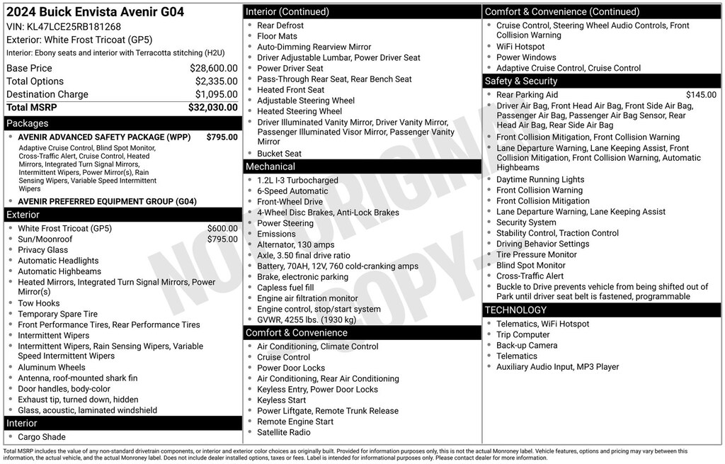 Recent Arrival! Clean CARFAX. 2024 Buick Envista Avenir Is nicely equipped with Avenir Advanced Safety Package (Adaptive Cruise Control, Front Intermittent Rainsense Wipers, Lane Change Alert w/Side Blind Zone Alert, Power-Adjustable Outside Heated Mirrors, and Rear Cross Traffic Alert), Preferred Equipment Group G04, 2 USB Ports (1 Type-A, 1 Type-C), 2-Way Power Driver Lumbar Control, 3.50 Final Drive Axle Ratio, 4-Way Manual Passenger Seat Adjuster, 4-Wheel Disc Brakes, 6 Speakers, 8-Way Power Driver Seat Adjuster, ABS brakes, Air Conditioning, Alloy wheels, AM/FM radio: SiriusXM, Auto High-beam Headlights, Auto-dimming Rear-View mirror, Automatic temperature control, Brake assist, Bumpers: body-color, Compass, Delay-off headlights, Driver door bin, Driver vanity mirror, Dual front impact airbags, Dual front side impact airbags, Electronic Stability Control, Emergency communication system: OnStar, Exterior Parking Camera Rear, Front anti-roll bar, Front Bucket Seats, Front Center Armrest, Front reading lights, Front wheel independent suspension, Fully automatic headlights, Heated door mirrors, Heated Driver & Front Passenger Seats, Heated front seats, Heated steering wheel, Illuminated entry, Low tire pressure warning, Occupant sensing airbag, Outside temperature display, Overhead airbag, Overhead console, Panic alarm, Passenger door bin, Passenger vanity mirror, Perforated Leather-Appointed Seat Trim, Power door mirrors, Power driver seat, Power Liftgate, Power steering, Power Tilt-Sliding Moonroof w/Manual Sunshade, Power windows, Premium 6-Speaker Audio System Feature, Radio data system, Radio: AM/FM Stereo Audio System, Rear Park Assist, Rear seat center armrest, Rear window defroster, Remote keyless entry, Security system, SiriusXM, Speed control, Split folding rear seat, Steering wheel mounted audio controls, Tachometer, Telescoping steering wheel, Tilt steering wheel, Traction control, Trip computer, Turn signal indicator mirrors, Variably intermittent wipers, Wheels: 19" Avenir Premium Pearl Nickel Aluminum, and Wireless Apple CarPlay/Wireless Android Auto.