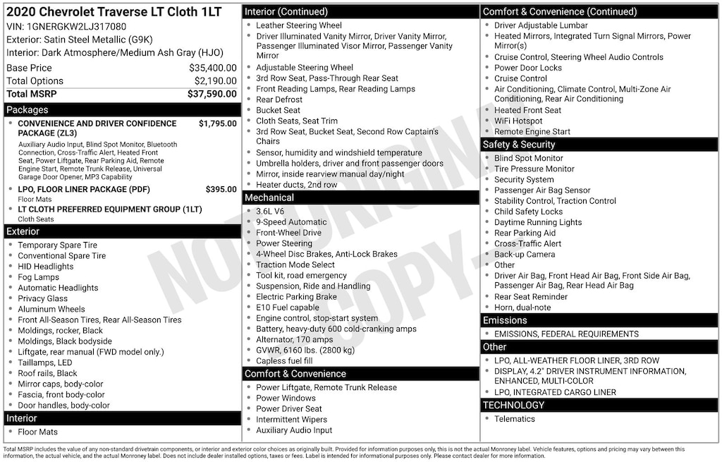 Clean CARFAX. 2020 Chevrolet Traverse LT 1LT Is nicely equipped with Convenience & Driver Confidence Package (4.2" Multi-Color Enhanced Driver Instrument Display, Heated Driver & Front Passenger Seats, Lane Change Alert w/Side Blind Zone Alert, Radio: Chevrolet Infotainment 3 Plus System, Rear Cross Traffic Alert, Rear Park Assist w/Audible Warning, Rear Power Liftgate, Remote Start, Universal Home Remote, and SiriusXM w/360L), Floor Liner Package (LPO) (1st & 2nd Row All-Weather Floor Liner (LPO), 3rd Row All-Weather Floor Liner (LPO), and Integrated Cargo Liner (LPO)), Preferred Equipment Group 1LT, 3.49 Axle Ratio, 3rd row seats: split-bench, 4-Wheel Disc Brakes, 6 Speakers, 7-Passenger Seating (2-2-3 Seating Configuration), ABS brakes, Air Conditioning, Alloy wheels, AM/FM radio: SiriusXM, Apple CarPlay/Android Auto, Automatic temperature control, Brake assist, Bumpers: body-color, Compass, Delay-off headlights, Driver door bin, Driver vanity mirror, Dual front impact airbags, Dual front side impact airbags, Electronic Stability Control, Emergency communication system: OnStar and Chevrolet connected services capable, Four wheel independent suspension, Front anti-roll bar, Front Bucket Seats, Front Center Armrest, Front dual zone A/C, Front fog lights, Front reading lights, Fully automatic headlights, Heated door mirrors, High-Intensity Discharge Headlights, Illuminated entry, Leather steering wheel, Low tire pressure warning, Occupant sensing airbag, Outside temperature display, Overhead airbag, Overhead console, Panic alarm, Passenger door bin, Passenger vanity mirror, Power door mirrors, Power driver seat, Power steering, Power windows, Premium Cloth Seat Trim, Radio data system, Radio: Chevrolet Infotainment System AM/FM Stereo, Rear air conditioning, Rear anti-roll bar, Rear reading lights, Rear window defroster, Rear window wiper, Remote keyless entry, Roof rack: rails only, Security system, SiriusXM Radio, Speed control, Speed-sensing steering, Spoiler, Steering wheel mounted audio controls, Tachometer, Telescoping steering wheel, Tilt steering wheel, Traction control, Trip computer, Turn signal indicator mirrors, Variably intermittent wipers, Voltmeter, and Wheels: 18" Bright Silver Painted Aluminum.