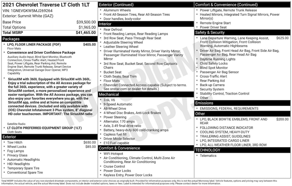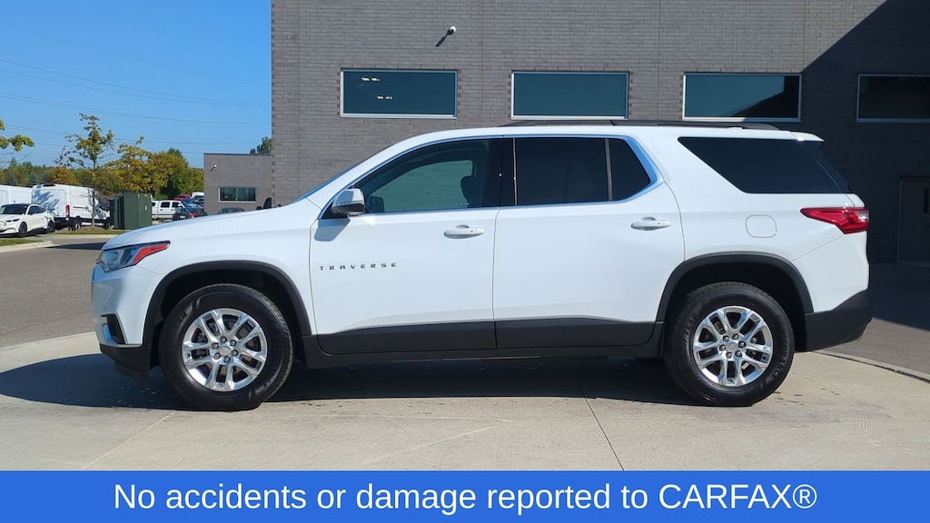 Clean CARFAX. 2021 Chevrolet Traverse LT 1LT Is nicely equipped with Chevy Safety Assist (Automatic Emergency Braking, Automatic Heated Steering Wheel, Following Distance Indicator, Forward Collision Alert, Front Pedestrian Braking, IntelliBeam Auto High Beam Control Headlamps, and Lane Keep Assist w/Lane Departure Warning), Floor Liner Package (LPO) (1st & 2nd Row All-Weather Floor Liner (LPO), 3rd Row All-Weather Floor Liner (LPO), and Integrated Cargo Liner (LPO)), Preferred Equipment Group 1LT, Trailering Equipment (Heavy-Duty Cooling System, Hitch Guidance w/Hitch View, and Trailering Assist Guidelines), AWD, 3.49 Axle Ratio, 3rd row seats: split-bench, 4-Wheel Disc Brakes, 6 Speakers, 7-Passenger Seating (2-2-3 Seating Configuration), ABS brakes, Air Conditioning, Alloy wheels, AM/FM radio: SiriusXM, Apple CarPlay/Android Auto, Automatic temperature control, Brake assist, Bright Wheel Locks (LPO), Bumpers: body-color, Compass, Delay-off headlights, Driver door bin, Driver vanity mirror, Dual front impact airbags, Dual front side impact airbags, Electronic Stability Control, Emergency communication system: OnStar and Chevrolet connected services capable, Four wheel independent suspension, Front & Rear Black Bowtie Emblems (LPO), Front anti-roll bar, Front Bucket Seats, Front Center Armrest, Front dual zone A/C, Front fog lights, Front reading lights, Fully automatic headlights, Garage door transmitter, Heated door mirrors, Heated front seats, High-Intensity Discharge Headlights, Illuminated entry, Leather steering wheel, Low tire pressure warning, Occupant sensing airbag, Outside temperature display, Overhead airbag, Overhead console, Panic alarm, Passenger door bin, Passenger vanity mirror, Power door mirrors, Power driver seat, Power Liftgate, Power steering, Power windows, Premium Cloth Seat Trim, Radio data system, Radio: Chevrolet Infotainment 3 Plus System, Rear air conditioning, Rear anti-roll bar, Rear reading lights, Rear window defroster, Rear window wiper, Remote keyless entry, Roof rack: rails only, Security system, SiriusXM w/360L, Speed control, Speed-sensing steering, Spoiler, Steering wheel mounted audio controls, Tachometer, Telescoping steering wheel, Tilt steering wheel, Traction control, Trip computer, Turn signal indicator mirrors, Variably intermittent wipers, Voltmeter, and Wheels: 18" Bright Silver Painted Aluminum.