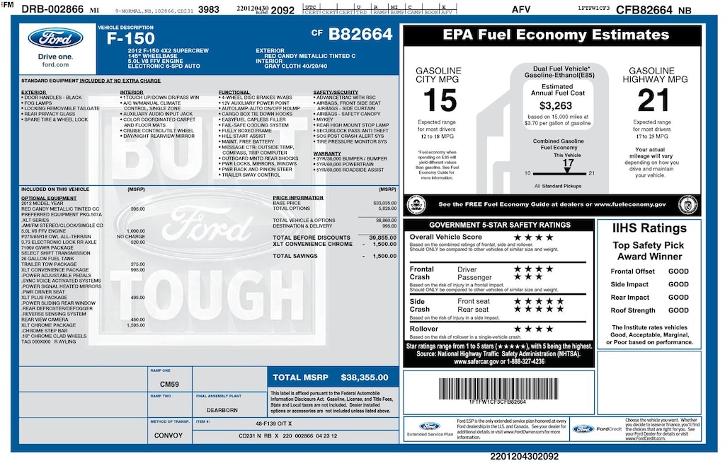 Recent Arrival! 2012 Ford F-150 XLT Is nicely equipped with Order Code 507A, XLT Chrome Package (18" Chrome-Clad Aluminum Wheels, 5" Chrome Running Boards, Chrome Door Handles w/Black Bezels, and Chrome Exhaust Tip), XLT Convenience Package (4.2" LCD Screen in Cluster, 6-Way Power Driver Seat, Heated Power Side Mirrors, Leather-Wrapped Steering Wheel, Power Adjustable Pedals, and SYNC), XLT Plus Package (Power Sliding Rear Window w/Defrost & Privacy Tint), GVWR: 7,100 lbs Payload Package, 17" Machined-Aluminum w/Painted Accents Wheels, 3.31 Axle Ratio, 4 Speakers, 4-Wheel Disc Brakes, ABS brakes, Air Conditioning, Alloy wheels, AM/FM radio, AM/FM Stereo/Clock/Single CD, Bumpers: chrome, CD player, Cloth 40/20/40 Front Seat, Compass, Delay-off headlights, Driver door bin, Driver vanity mirror, Dual front impact airbags, Dual front side impact airbags, Electronic Stability Control, Front anti-roll bar, Front Center Armrest w/Storage, Front fog lights, Front reading lights, Front wheel independent suspension, Fully automatic headlights, Illuminated entry, Low tire pressure warning, Occupant sensing airbag, Outside temperature display, Overhead airbag, Overhead console, Panic alarm, Passenger door bin, Passenger vanity mirror, Power door mirrors, Power steering, Power windows, Radio data system, Rear reading lights, Rear step bumper, Remote keyless entry, Security system, Speed control, Speed-sensing steering, Split folding rear seat, Tachometer, Tilt steering wheel, Traction control, and Variably intermittent wipers.