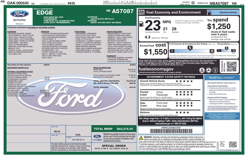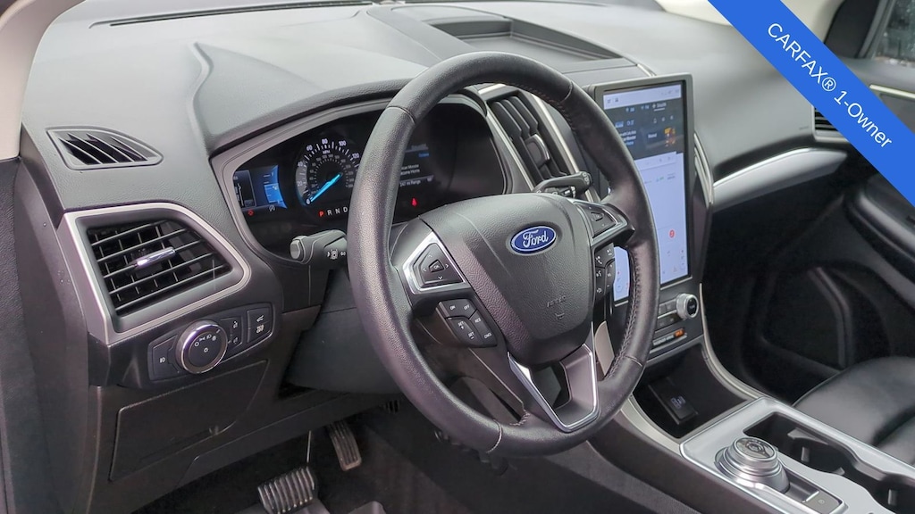 2022 Ford Edge SEL Is nicely equipped with Convenience Package (110V/150W AC Power Outlet, Fog Lamps w/Chrome Bezel, Perimeter Alarm, Power Liftgate, Remote Start System, SecuriCode Keyless Entry Keypad, Universal Garage Door Opener (UGDO), and Wireless Charging Pad), Equipment Group 201A, AWD, 3.80 Axle Ratio, 4-Wheel Disc Brakes, 6 Speakers, ABS brakes, ActiveX Seating Material Heated Bucket Seats, Air Conditioning, Alloy wheels, AM/FM radio: SiriusXM with 360L, Auto High-beam Headlights, Auto-dimming Rear-View mirror, Automatic temperature control, Brake assist, Bumpers: body-color, Compass, Delay-off headlights, Driver door bin, Driver vanity mirror, Dual front impact airbags, Dual front side impact airbags, Electronic Stability Control, Emergency communication system: SYNC 4 911 Assist, FordPass Connect, Four wheel independent suspension, Front anti-roll bar, Front Bucket Seats, Front Center Armrest w/Storage, Front dual zone A/C, Front reading lights, Fully automatic headlights, Heated door mirrors, Heated front seats, Illuminated entry, Knee airbag, Low tire pressure warning, Occupant sensing airbag, Outside temperature display, Overhead airbag, Overhead console, Panic alarm, Passenger door bin, Passenger vanity mirror, Power door mirrors, Power driver seat, Power passenger seat, Power steering, Power windows, Radio: AM/FM Stereo/MP3 Capable, Rear anti-roll bar, Rear Parking Sensors, Rear reading lights, Rear seat center armrest, Rear window defroster, Rear window wiper, Remote keyless entry, SiriusXM w/360L, Speed control, Speed-Sensitive Wipers, Split folding rear seat, Spoiler, Steering wheel mounted audio controls, SYNC 4A w/Enhanced Voice Recognition, Tachometer, Telescoping steering wheel, Tilt steering wheel, Traction control, Trip computer, Variably intermittent wipers, and Wheels: 18" Sparkle Silver-Painted Aluminum.