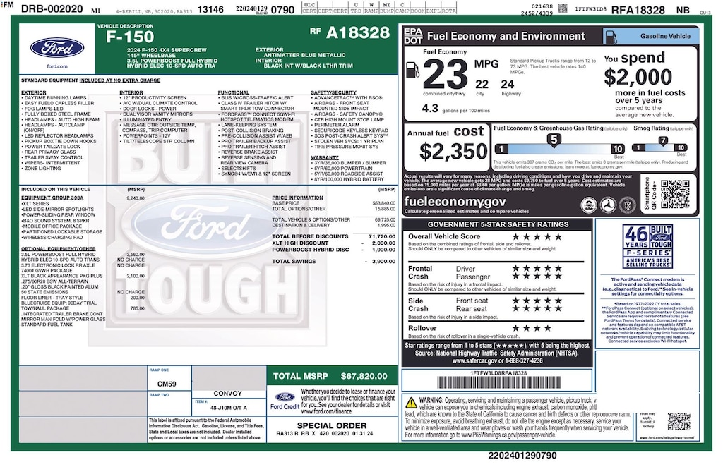 Recent Arrival! Clean CARFAX. 2024 Ford F-150 XLT Is nicely equipped with Equipment Group 303A High (400W Cab & Bed Outlets, Adaptive Cruise Control w/Stop & Go, Ford BlueCruise Equipped (90-Day Trial), Heated Front Seats, Intelligent Access w/Push Button Start, Power Glass Heated Sideview Mirrors, Power-Adjustable Pedals, Power-Sliding Rear Window, Radio: B&O Sound System by Bang & Olufsen, Remote Start System w/Remote Tailgate Release, and Wheels: 20" Chrome-Like PVD), Mobile Office Package, Tow/Haul Package (Integrated Trailer Brake Controller), XLT Black Appearance Package (6" Black Running Boards, Black Exterior Badging, Black Grille, Body-Color Front & Rear Bumpers, Dark Interior Appliques, Floor Shifter, Gray Box Side Decal, Unique Sport Cloth 40/Console/40 Front-Seats, and Wheels: 18" Gloss Black), 3.5L PowerBoost Full-Hybrid V6, 4WD, 4-Wheel Disc Brakes, 6 Speakers, ABS brakes, Air Conditioning, Alloy wheels, AM/FM radio: SiriusXM with 360L, Auto High-beam Headlights, Auto-dimming Rear-View mirror, Automatic temperature control, Brake assist, Bumpers: chrome, Chrome wheels, Cloth 40/20/40 Front Seat, Compass, Delay-off headlights, Driver door bin, Driver vanity mirror, Dual front impact airbags, Dual front side impact airbags, Electronic Stability Control, Emergency communication system: SYNC 4 911 Assist, Front anti-roll bar, Front Center Armrest w/Storage, Front dual zone A/C, Front fog lights, Front reading lights, Front wheel independent suspension, Fully automatic headlights, Heated door mirrors, Illuminated entry, Low tire pressure warning, Navigation system: Connected Navigation, Occupant sensing airbag, Outside temperature display, Overhead airbag, Overhead console, Panic alarm, Passenger door bin, Passenger vanity mirror, Power door mirrors, Power driver seat, Power steering, Power windows, Radio data system, Radio: AM/FM SiriusXM w/360L, Rear reading lights, Rear step bumper, Rear window defroster, Remote keyless entry, Security system, Speed control, Split folding rear seat, Steering wheel mounted audio controls, SYNC 4 w/Enhanced Voice Recognition, Tachometer, Telescoping steering wheel, Tilt steering wheel, Traction control, Tray Style Floor Liner w/Carpet Mats, Trip computer, Variably intermittent wipers, Voltmeter, and Wheels: 18" Chrome-Like PVD.