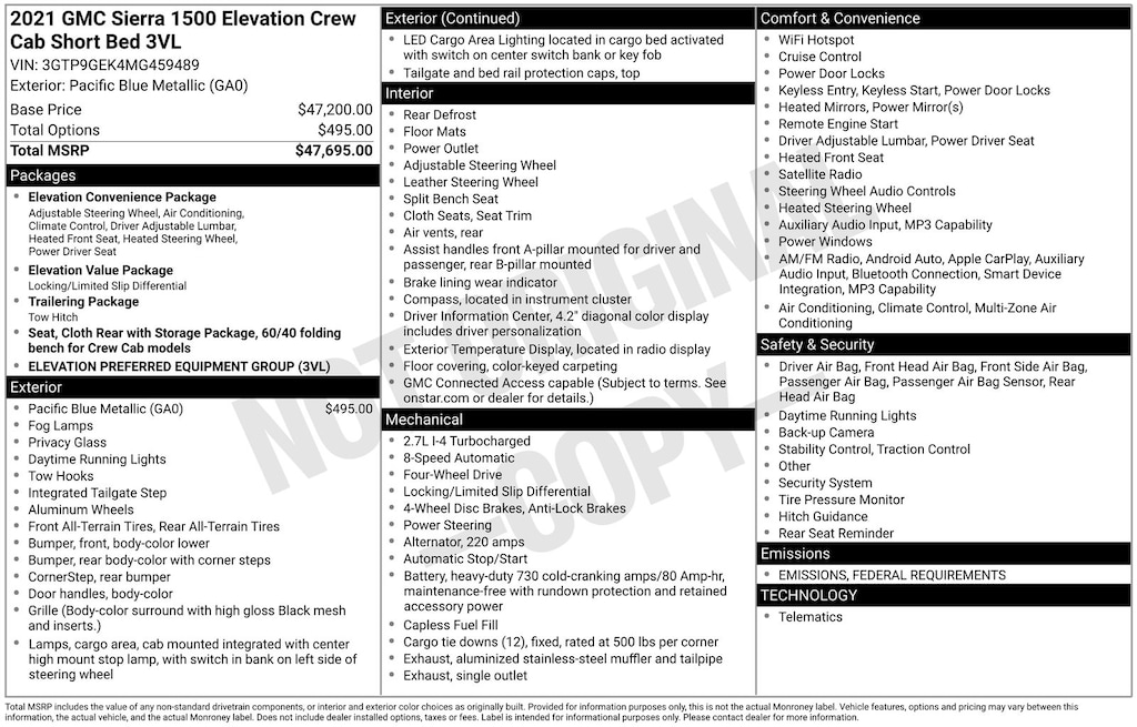 Clean CARFAX. 2021 GMC Sierra 1500 Elevation Is nicely equipped with Cloth Rear Seat w/Storage Package, Elevation Convenience Package (Dual-Zone Automatic Climate Control, Heated Steering Wheel, Manual Tilt-Wheel & Telescoping Steering Column, and Rear Wheelhouse Liners), Elevation Value Package (Auto-Locking Rear Differential), Trailering Package (Hitch Guidance), 8-Speed Automatic, 4WD, Black Cloth, 10-Way Power Driver Seat Adjuster w/Lumbar, 12-Volt Rear Auxiliary Power Outlet, 220 Amp Alternator, 3.42 Rear Axle Ratio, 4-Way Manual Passenger Seat Adjuster, 4-Wheel Disc Brakes, 4G LTE Wi-Fi Hotspot Capable, 6 Speakers, 6-Speaker Audio System Feature, ABS brakes, Air Conditioning, Alloy wheels, AM/FM radio: SiriusXM, Apple CarPlay/Android Auto, Automatic temperature control, Body-Color Surround Grille, Brake assist, Bumpers: body-color, Cloth Seat Trim, Color-Keyed Carpeting Floor Covering, Compass, Deep-Tinted Glass, Delay-off headlights, Driver door bin, Driver vanity mirror, Dual front impact airbags, Dual front side impact airbags, Electric Rear-Window Defogger, Electrical Lock Control Steering Column, Electronic Stability Control, Front 40/20/40 Split-Bench Seat, Front anti-roll bar, Front Center Armrest w/Storage, Front dual zone A/C, Front fog lights, Front Frame-Mounted Black Recovery Hooks, Front reading lights, Front Rubberized-Vinyl Floor Mats, Front wheel independent suspension, Fully automatic headlights, GMC Connected Access Capable, Heated door mirrors, Heated Driver & Front Outboard Passenger Seating, Heated front seats, Heated steering wheel, Heavy Duty Suspension, Illuminated entry, Keyless Open & Start, LED Cargo Area Lighting, Low tire pressure warning, Occupant sensing airbag, OnStar & GMC Connected Services Capable, Outside temperature display, Overhead airbag, Overhead console, Panic alarm, Passenger door bin, Passenger vanity mirror, Power Door Locks, Power door mirrors, Power driver seat, Power Front Windows w/Driver Express Up/Down, Power Front Windows w/Passenger Express Down, Power Rear Windows w/Express Down, Power steering, Power windows, Premium audio system: GMC Infotainment System, Radio data system, Radio: GMC Infotainment Audio System, Rear Dual USB Charging-Only Ports, Rear reading lights, Rear Rubberized-Vinyl Floor Mats, Rear seat center armrest, Rear step bumper, Rear window defroster, Remote keyless entry, Remote Vehicle Starter System, Security system, SiriusXM Radio, Speed control, Speed-sensing steering, Split folding rear seat, Steering Wheel Audio Controls, Steering wheel mounted audio controls, Tachometer, Telescoping steering wheel, Theft Deterrent System (Unauthorized Entry), Tilt steering wheel, Traction control, Trip computer, Variably intermittent wipers, Voltmeter, and Wheels: 20" x 9" Black Gloss Painted Aluminum.