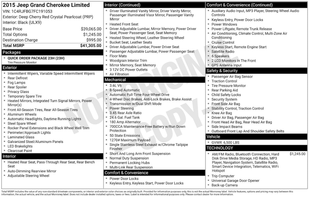 Recent Arrival! 2015 Jeep Grand Cherokee Limited Is nicely equipped with Quick Order Package 23H (High Pressure Tires Tracking), 4WD, GPS Navigation, 1-Yr SiriusXM Traffic Service, 1-Yr SIRIUSXM Travel Link Service, 18" x 8.0" Aluminum Polished Wheels, 3.45 Rear Axle Ratio, 4-Wheel Disc Brakes, 6 Month Trial (Registration Required), 6 Speakers, 8.4" Touchscreen Display, ABS brakes, Air Conditioning, Alloy wheels, AM/FM radio: SiriusXM, Anti-whiplash front head restraints, Audio memory, Auto-dimming door mirrors, Auto-dimming Rear-View mirror, Automatic temperature control, Brake assist, Bumpers: body-color, Compass, Delay-off headlights, Driver door bin, Driver vanity mirror, Dual front impact airbags, Dual front side impact airbags, Electronic Stability Control, Exterior Parking Camera Rear, For Details Visit DriveUconnect.com, Four wheel independent suspension, Front anti-roll bar, Front Bucket Seats, Front Center Armrest w/Storage, Front dual zone A/C, Front fog lights, Front reading lights, Fully automatic headlights, Garage door transmitter, GPS Antenna Input, HD Radio, Heated door mirrors, Heated front seats, Heated rear seats, Heated steering wheel, Illuminated entry, Integrated Voice Command w/Bluetooth, Knee airbag, Leather Shift Knob, Low tire pressure warning, Memory seat, Normal Duty Suspension, Occupant sensing airbag, Outside temperature display, Overhead airbag, Overhead console, Panic alarm, Passenger door bin, Passenger vanity mirror, Power door mirrors, Power driver seat, Power Liftgate, Power passenger seat, Power steering, Power windows, Premium Leather Trimmed Bucket Seats, Radio data system, Radio: Uconnect 5.0, Radio: Uconnect 8.4 NAV, Rear anti-roll bar, Rear Parking Sensors, Rear reading lights, Rear seat center armrest, Rear window defroster, Rear window wiper, Rear-View Auto-Dimming Mirror w/Microphone, Remote keyless entry, Roadside Assistance & 9-1-1 Call, Roof rack: rails only, Security system, SIRIUSXM Satellite Radio, SIRIUSXM Traffic, SiriusXM Travel Link, Speed control, Speed-Sensitive Wipers, Split folding rear seat, Spoiler, Steering wheel mounted audio controls, Tachometer, Telescoping steering wheel, Tilt steering wheel, Traction control, Trip computer, Turn signal indicator mirrors, Uconnect Access, and Variably intermittent wiperS.