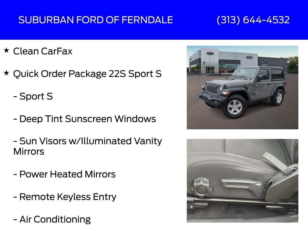 Sting-Gray Clearcoat 2021 Jeep Wrangler Sport S 4WD 8-Speed Automatic 2.0L I4 DOHC Clean CarFax, 7.0" Touchscreen Display, Air Conditioning, Air Conditioning w/Auto Temperature Control, Air Filtering, Apple CarPlay, Automatic Headlamps, Black 3-Piece Hard Top, Cluster 7.0" TFT Color Display, Deep Tint Sunscreen Windows, Freedom Panel Storage Bag, Front 1-Touch Down Power Windows, Google Android Auto, GPS Antenna Input, Integrated Center Stack Radio, Leather Wrapped Steering Wheel, No Soft Top, ParkView Rear Back-Up Camera, Power Heated Mirrors, Quick Order Package 22S Sport S, Radio: Uconnect 4 w/7" Display, Rear Window Defroster, Rear Window Wiper/Washer, Remote Keyless Entry, Security Alarm, SiriusXM Satellite Radio, Speed Sensitive Power Locks, Sport S, Sun Visors w/Illuminated Vanity Mirrors, Technology Group, USB Host Flip, Wheels: 17" x 7.5" Tech Silver Aluminum.