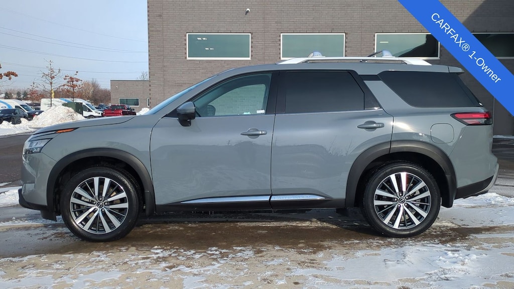 Clean CARFAX. 2022 Nissan Pathfinder Platinum Is nicely equipped with 4WD, ABS brakes, Active Cruise Control, Alloy wheels, Electronic Stability Control, Front dual zone A/C, Heated door mirrors, Heated front seats, Heated rear seats, Illuminated entry, Low tire pressure warning, Navigation System, Power Liftgate, Power moonroof, Remote keyless entry, Traction control, 13 Speakers, 3rd row seats: bench, 4-Wheel Disc Brakes, Air Conditioning, AM/FM radio: SiriusXM, Auto High-beam Headlights, Auto tilt-away steering wheel, Auto-dimming Rear-View mirror, Automatic temperature control, Axle Ratio: TBD, Bodyside moldings, Bose Premium Audio System, Brake assist, Bumpers: body-color, Climate Controlled Front Bucket Seats, Delay-off headlights, Driver door bin, Driver vanity mirror, Dual front impact airbags, Dual front side impact airbags, Emergency communication system: NissanConnect Services, Exterior Parking Camera Rear, Four wheel independent suspension, Front anti-roll bar, Front Bucket Seats, Front Center Armrest, Front fog lights, Front reading lights, Fully automatic headlights, Garage door transmitter: HomeLink, Heads-Up Display, Heated steering wheel, Knee airbag, Leather steering wheel, Memory seat, Navigation system: NissanConnect Navigation, NissanConnect w/Navigation & Services, Occupant sensing airbag, Outside temperature display, Overhead airbag, Overhead console, Panic alarm, Passenger door bin, Passenger vanity mirror, Power door mirrors, Power driver seat, Power passenger seat, Power steering, Power windows, Radio data system, Radio: AM/FM Audio System, Rain sensing wipers, Rear air conditioning, Rear anti-roll bar, Rear reading lights, Rear side impact airbag, Rear window defroster, Rear window wiper, Reclining 3rd row seat, Security system, Semi-Aniline Leather Seating Surfaces, Speed control, Speed-sensing steering, Speed-Sensitive Wipers, Split folding rear seat, Spoiler, Steering wheel memory, Steering wheel mounted audio controls, Tachometer, Telescoping steering wheel, Tilt steering wheel, Trip computer, Turn signal indicator mirrors, Variably intermittent wipers, Ventilated front seats, and Wheels: 20" Alloy w/Unique Finish.