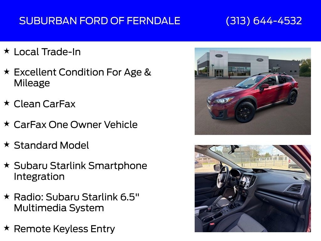 Venetian Red Pearl 2018 Subaru Crosstrek 2.0i Premium AWD 6-Speed Manual 2.0L 16V DOHC Local Trade-In, Excellent Condition For Age & Mileage, Clean CarFax, CarFax One Owner Vehicle, Apple CarPlay/Android Auto, Exterior Parking Camera Rear, Fully Automatic Headlights, Heated External Mirrors, Heated Front Seats, Radio: Subaru Starlink 6.5" Multimedia System, Remote Keyless Entry, Standard Model, Subaru Starlink Smartphone Integration.